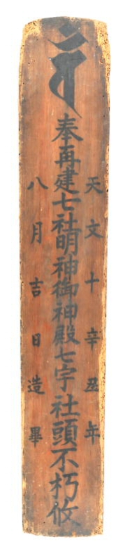 棟札は、建物を建てた時に、建てた年、建物の名前とその目的や歴史、お金を出した人、建てた人(大工)、建物に込めた願いなどを記した木の板です。なかには、村の掟や、まじないの言葉・記号など、色々な事柄が記されています。